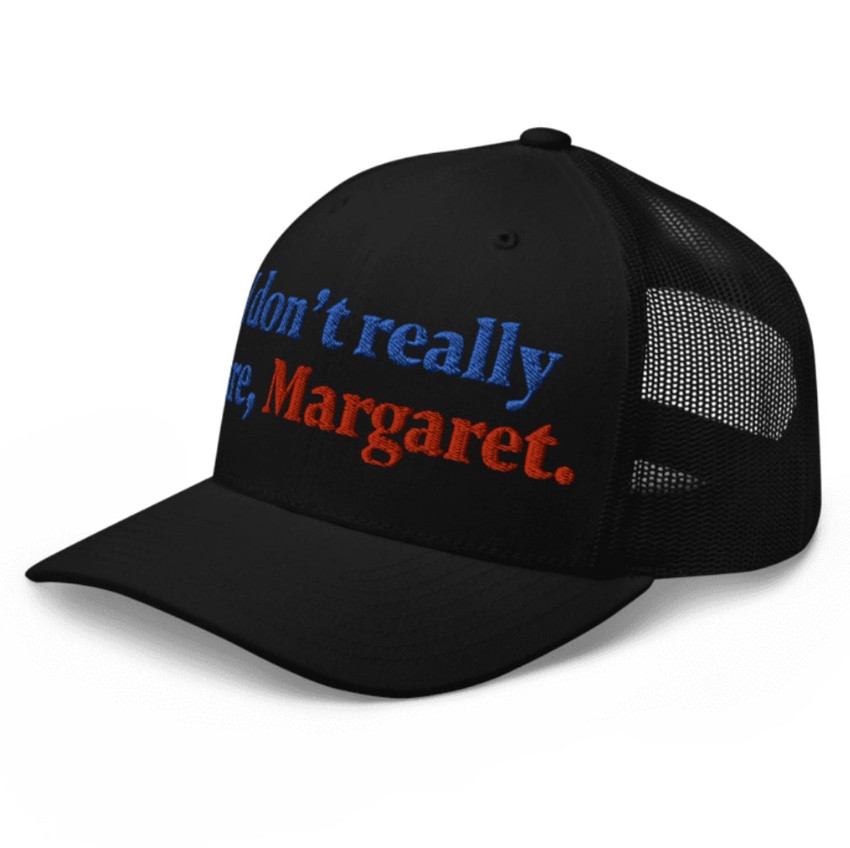Show your support for JD Vance and his unwavering commitment to putting America First with our exclusive “I Don’t Really Care Margaret” trucker cap.