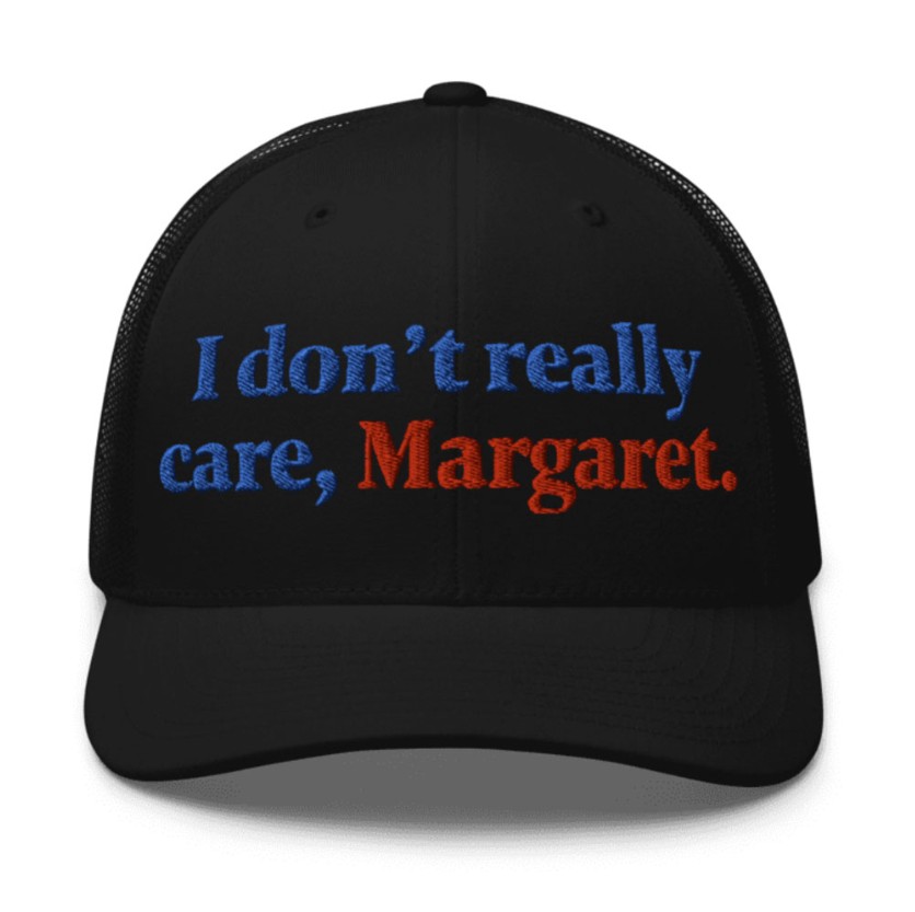Embroidered “I Don’t Really Care Margaret” slogan on the front