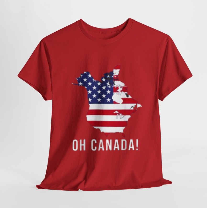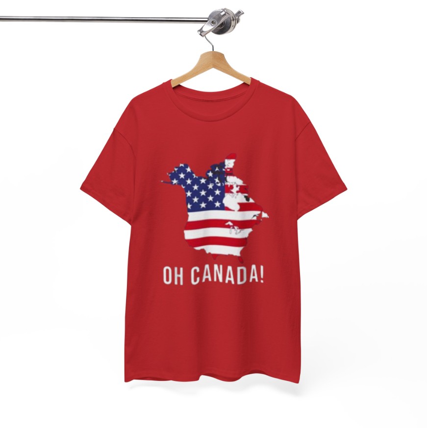 Show your Canadian pride with a touch of humor in this hilarious “Oh Canada” T-shirt featuring a caricature of Donald Trump draped in the American flag.